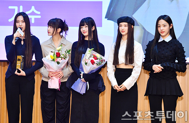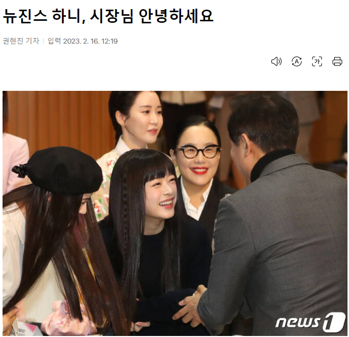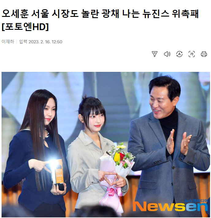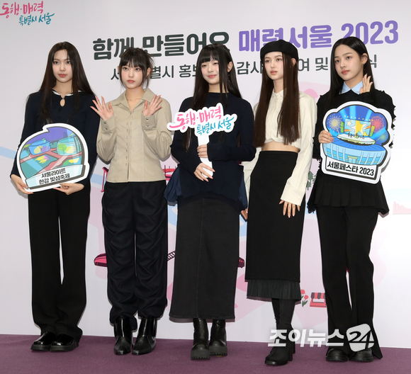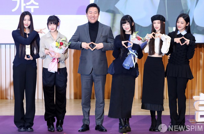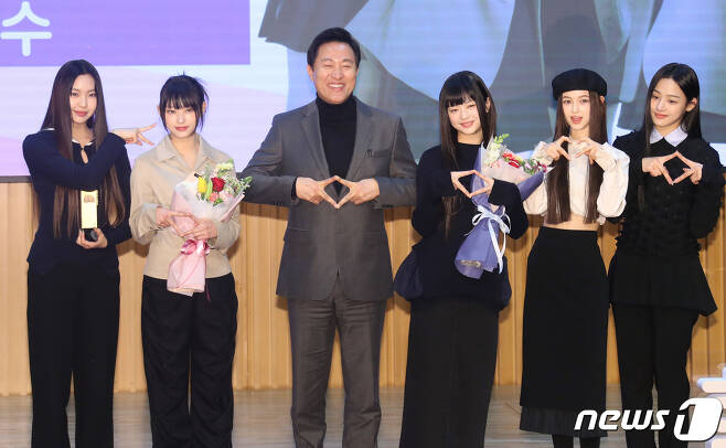 뉴진스 혜인, 해린, 하니, 다니엘, 민지가 16일 오전 서울특별시청에서 열린 ‘서울홍보대사 감사패 수여 및 위촉식’에서 홍보대사로 위촉된 뒤 오세훈 서울시장(왼쪽 세 번째)과 함께 포즈를 취하고 있다. 2023.2.16