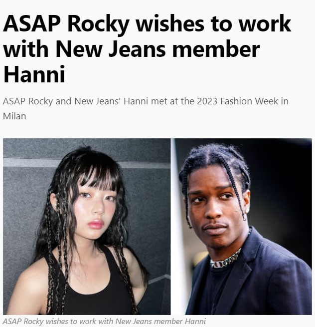 구찌(Gucci)의 최연소 글로벌 엠버서더인 뉴진스(NewJeans) 하니(Hanni), 어제 2월 25일 밀라노 구찌 행사에 참여해 에이셉 라키(ASAP Rocky)를 만나 함께 담소를 나누는 모습이 포착되었는데요. 이후 일제히 외신에서는 에이셉 라키가 뉴진스 하니에게 협업 의사를 밝혔다고 보도했습니다.