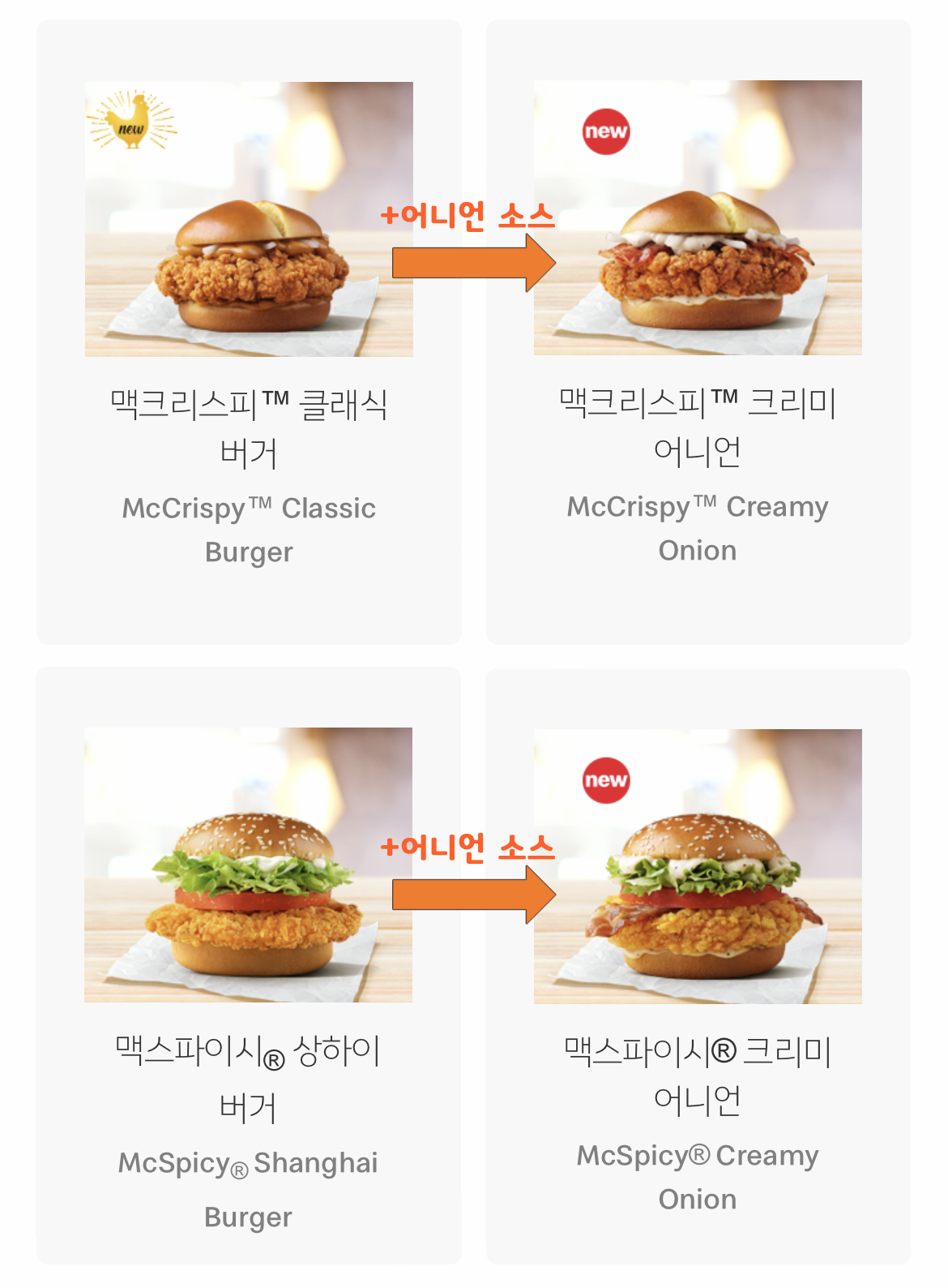 맥스파이시 상하이 버거에 크리미어니언 소스를 추가한 것이 맥스파이시 크리미어니언 입니다.