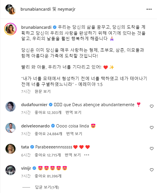 세계 최고의 축구선수 네이마르와 그의 여자친구 브루노 비앙카르디 인스타 계정에 올라온 임신 소식