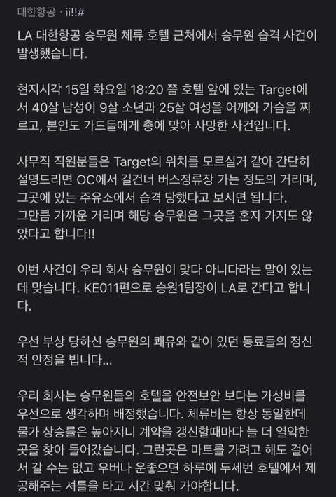 한편 여성 승무원이 봉변을 당한 사건이 발생한 가운데, 대한항공 승무원들이 회사의 열악한 처우를 성토하며 울분을 터뜨리고 있습니다. LA 피습 사건이 전해지자 대한항공 소속 승무원들은 블라인드 직장인 커뮤니티와 여러 온라인 커뮤니티를 통해 "참고 참았다"며 아우성을 쏟아냈습니다. 직원들은 계속해서 글을 공유해 근무 환경의 현실을 폭로하며 회사의 처우 개선을 촉구하고 있는데요. 특히 사건 발생 직후 회사가 '해외 체류 규정'에 대해 재공지를 올린 것은 직원들의 분노를 폭발시킨 큰 계기가 됐습니다. 공지를 통해 "직원들이 개인적인 일탈 행위를 하지 말 것"을 강조하자, 승무원들은 "일탈이 아닌 생존을 위해 식료품을 사러 간 것"이라며 분노를 금치 못했습니다. 다운타운은 해가 지면 치안이 위험하다고 하는데요, 그런 곳에서 근무 중인 직원들에게 식사도 제공되지 않은 것이 이번 불상사의 원인이 아닌가 생각이 됩니다.